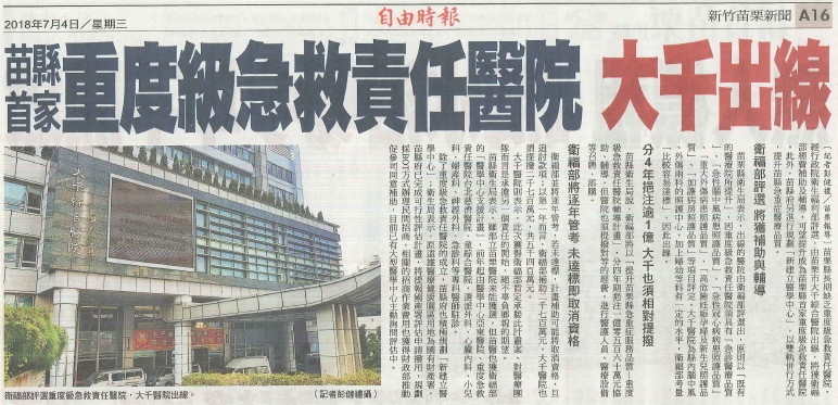 107.07.04自由:苗栗首家重度急救責任醫院 大千出線