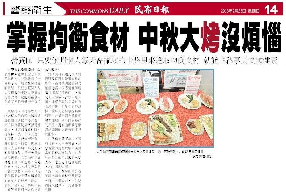 107.09.23民眾日報:掌握均衡食材中秋大烤沒煩惱