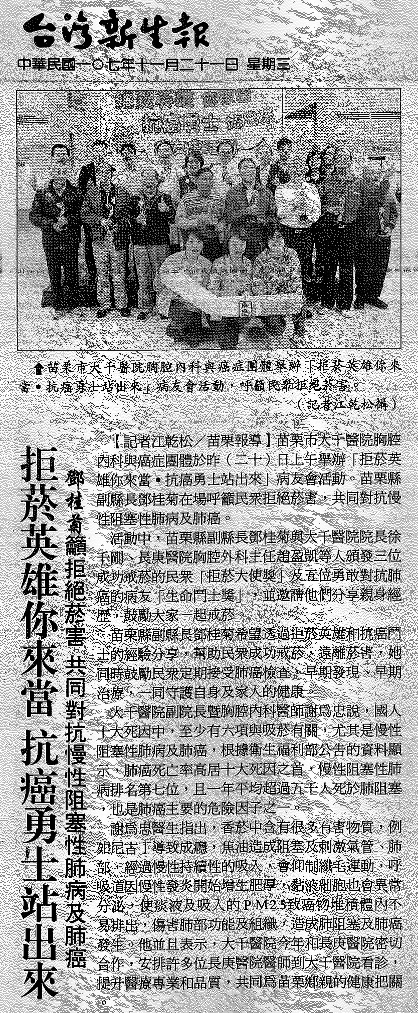 107.11.21台灣新生報:拒菸英雄你來當抗癌勇士站出來