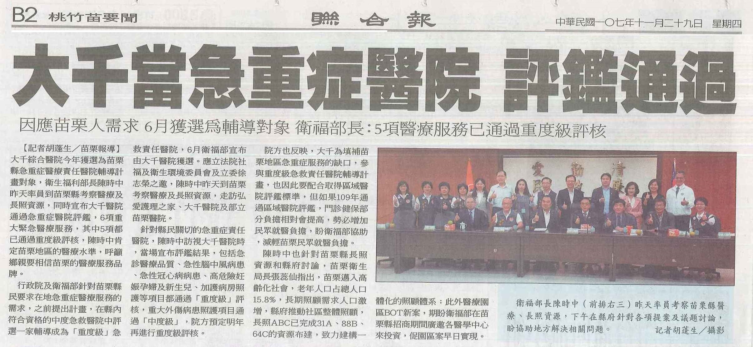 107.11.29聯合:大千當急重症醫院評鑑通過