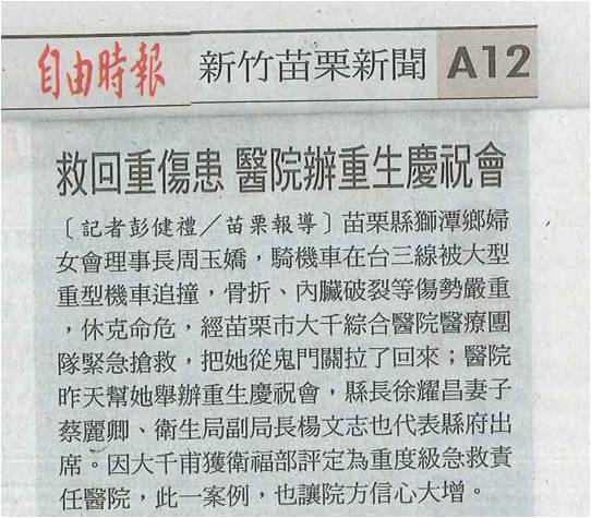 108.01.04自由:救回重傷患 醫院辦重生慶祝會