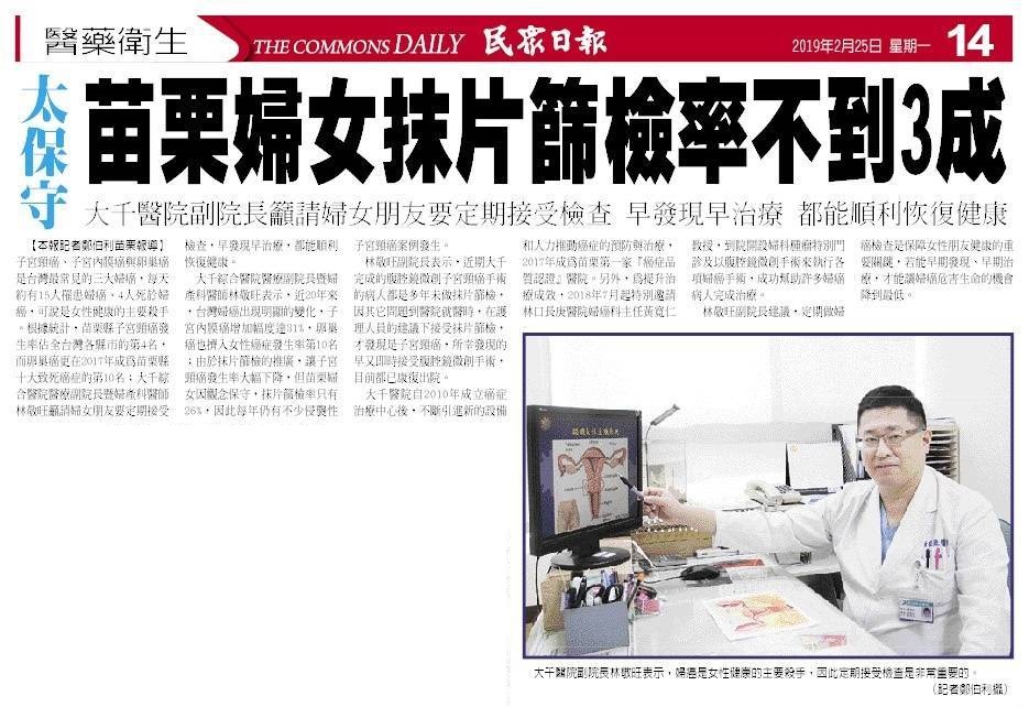 108.02.25民眾日報:太保守苗栗婦女抹片篩檢率不到3成