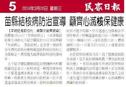 108.03.20民眾日報:苗縣結核病防治宣導籲齊心滅核保健康