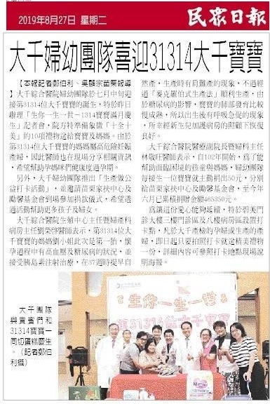 108.08.27民眾日報:大千婦幼團隊喜迎31314大千寶寶