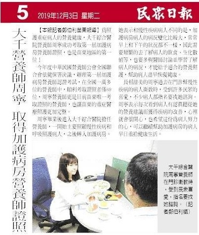 108.12.03民眾日報:大千營養師周寧取得加護病房營養師證照