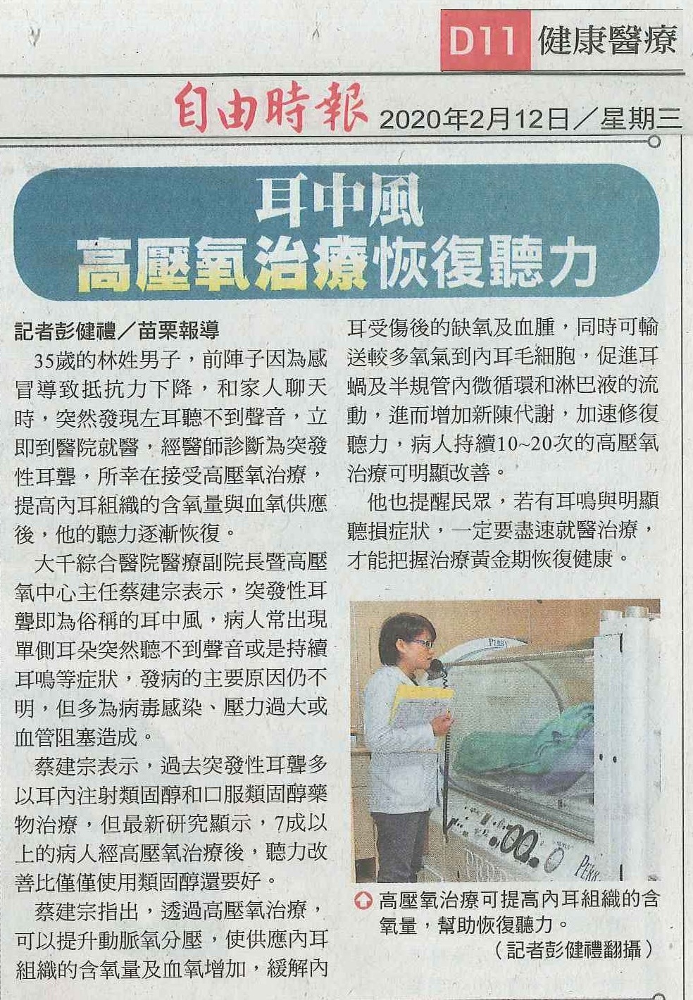 109.02.12自由:耳中風高壓氧治療恢復聽力