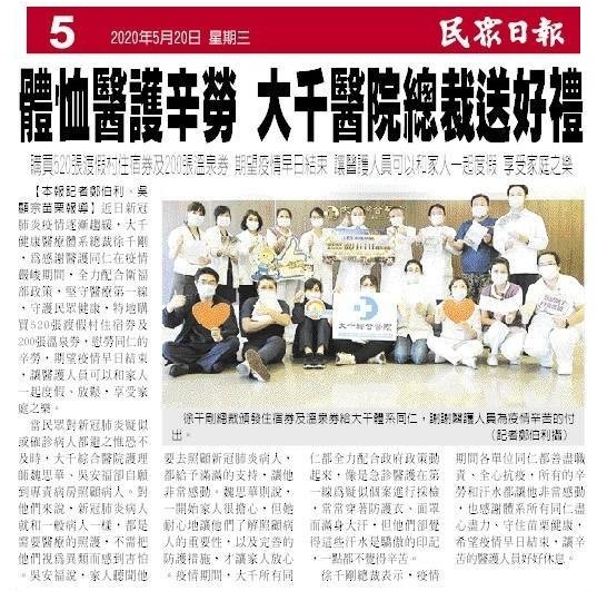 109.05.20民眾日報:體恤醫護辛勞大千醫院總裁送好禮