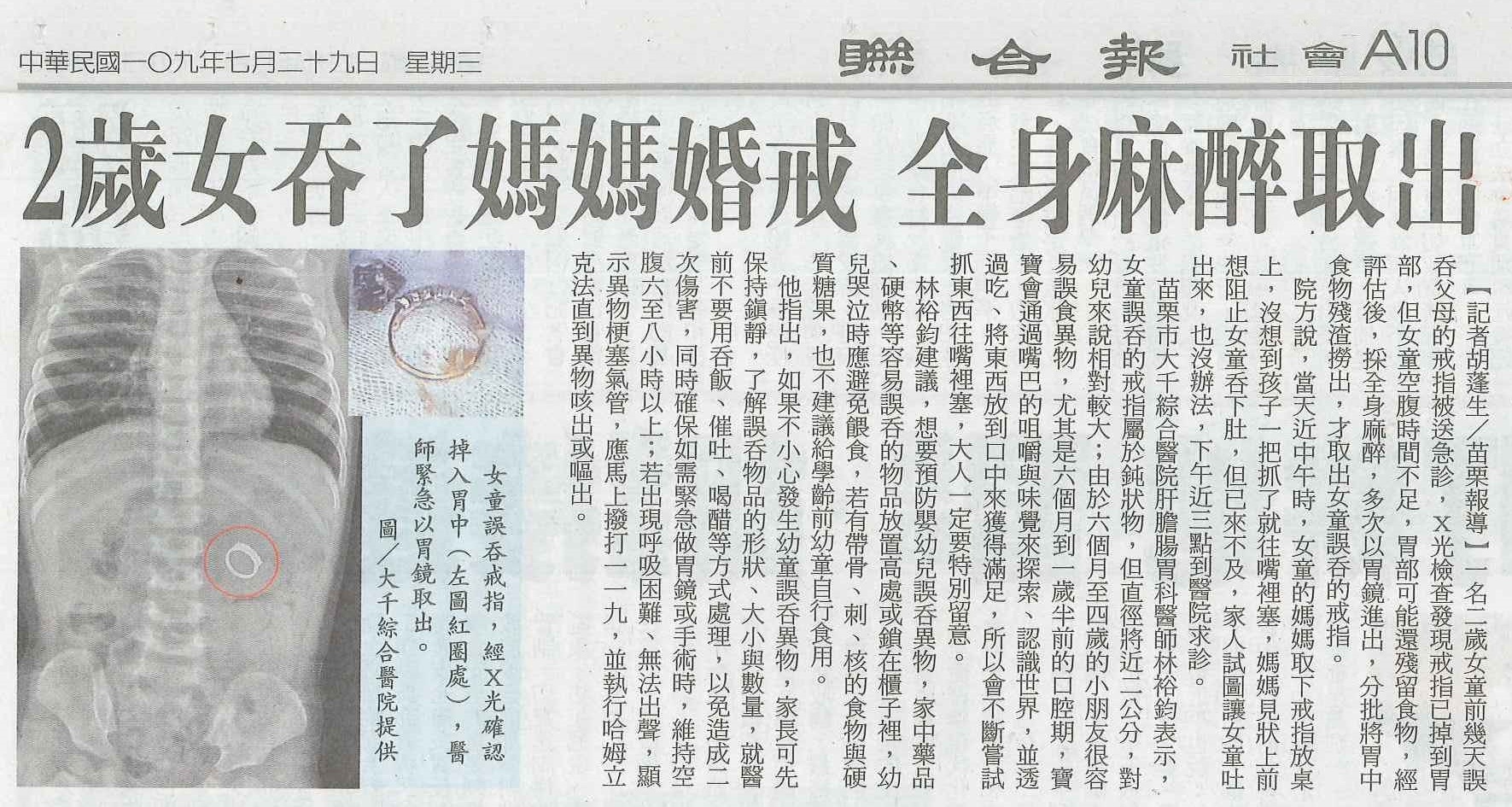 1090729聯合-2歲女吞了媽媽婚戒全身麻醉取出