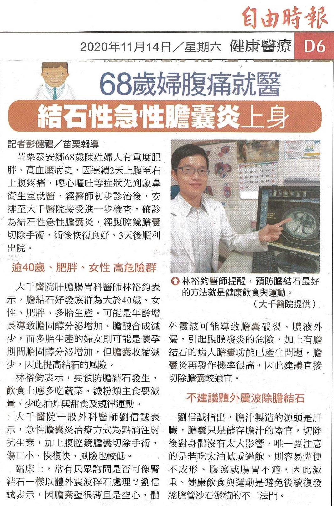 1091114自由-68歲婦腹痛就醫結石性急性膽囊炎上身
