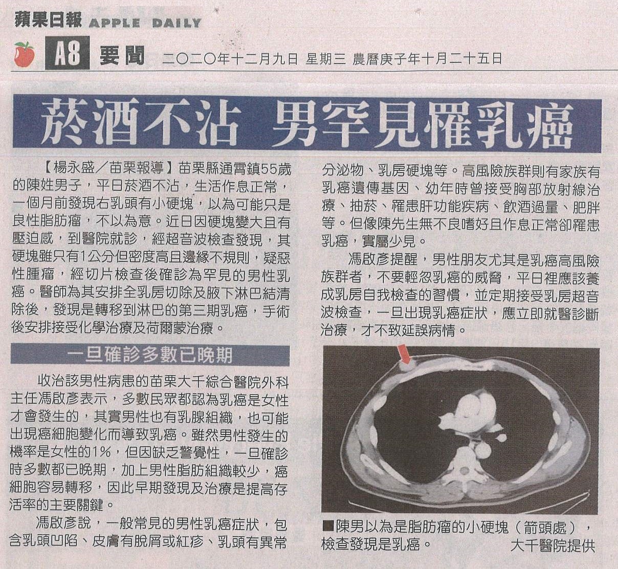 1091209蘋果-菸酒不沾男罕見罹乳癌