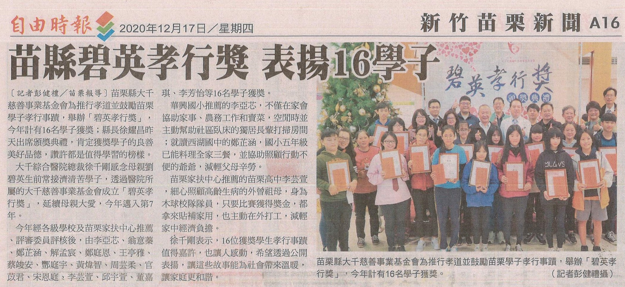 1091217自由-苗縣碧英孝行獎表揚16學子