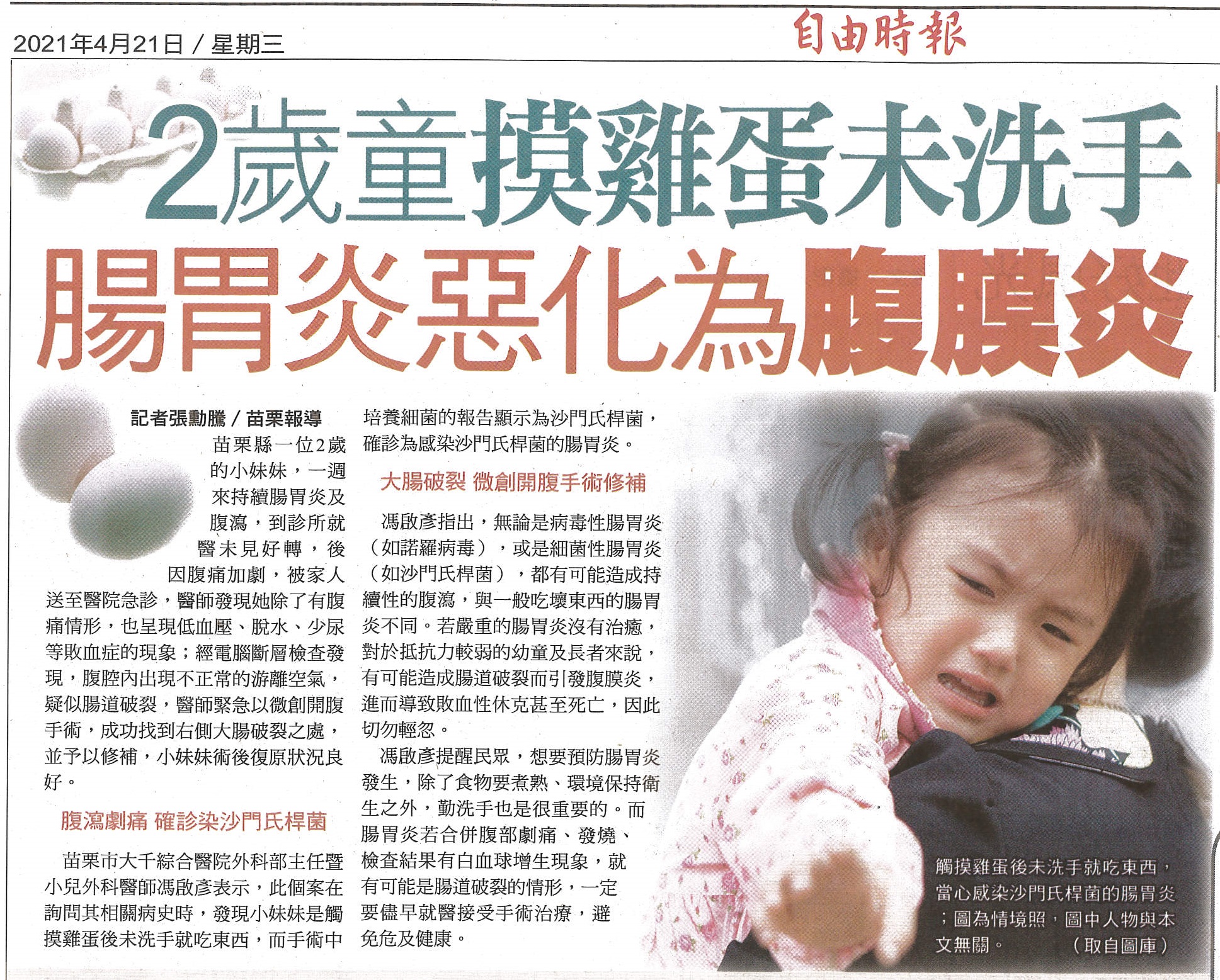 1100421自由-2歲童摸雞蛋未洗手腸胃炎惡化為腹膜炎