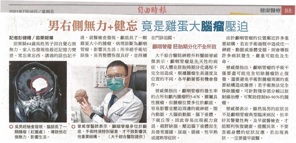 1100716自由-男右側無力加健忘竟是雞蛋大腦瘤壓迫