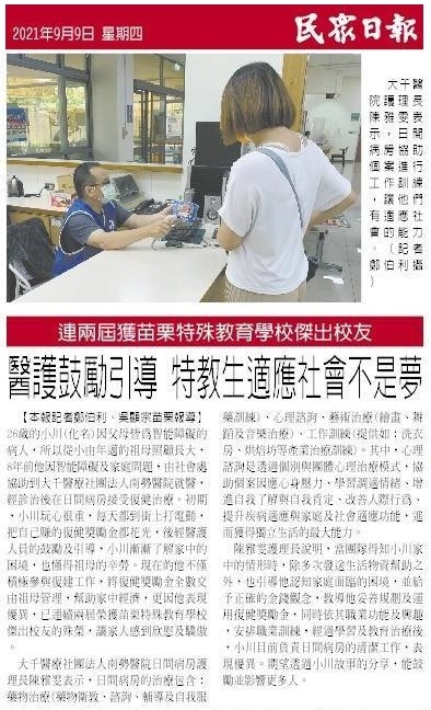 1100909民眾日報-醫護鼓勵引導特教生適應社會不是夢