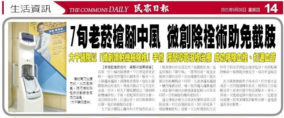 1100930民眾日報-7旬老菸槍腳中風微創除栓術助免截肢
