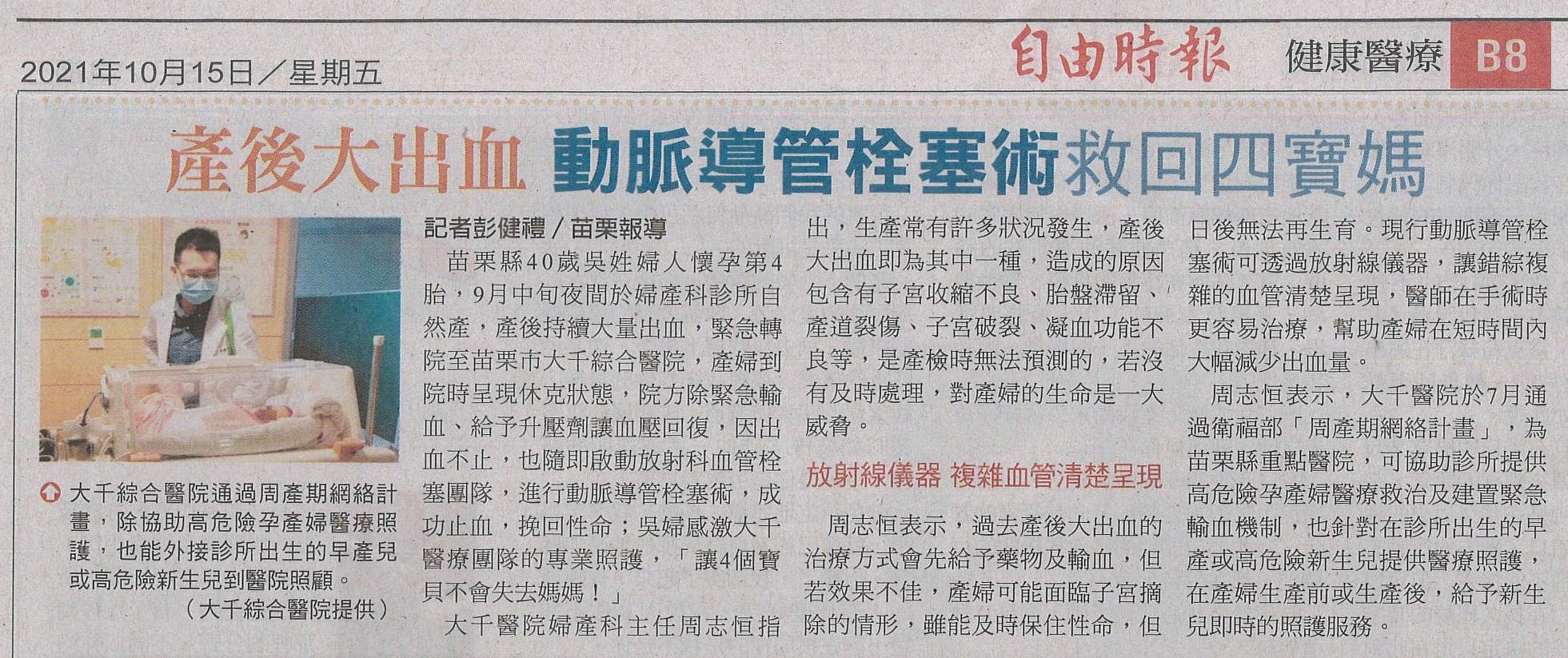 1101015自由-產後大出血動脈導管栓塞術救回四寶媽