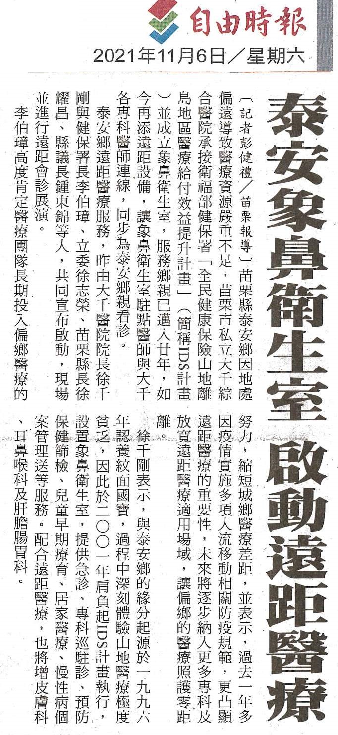 1101106自由-泰安象鼻衛生室啟動遠距醫療