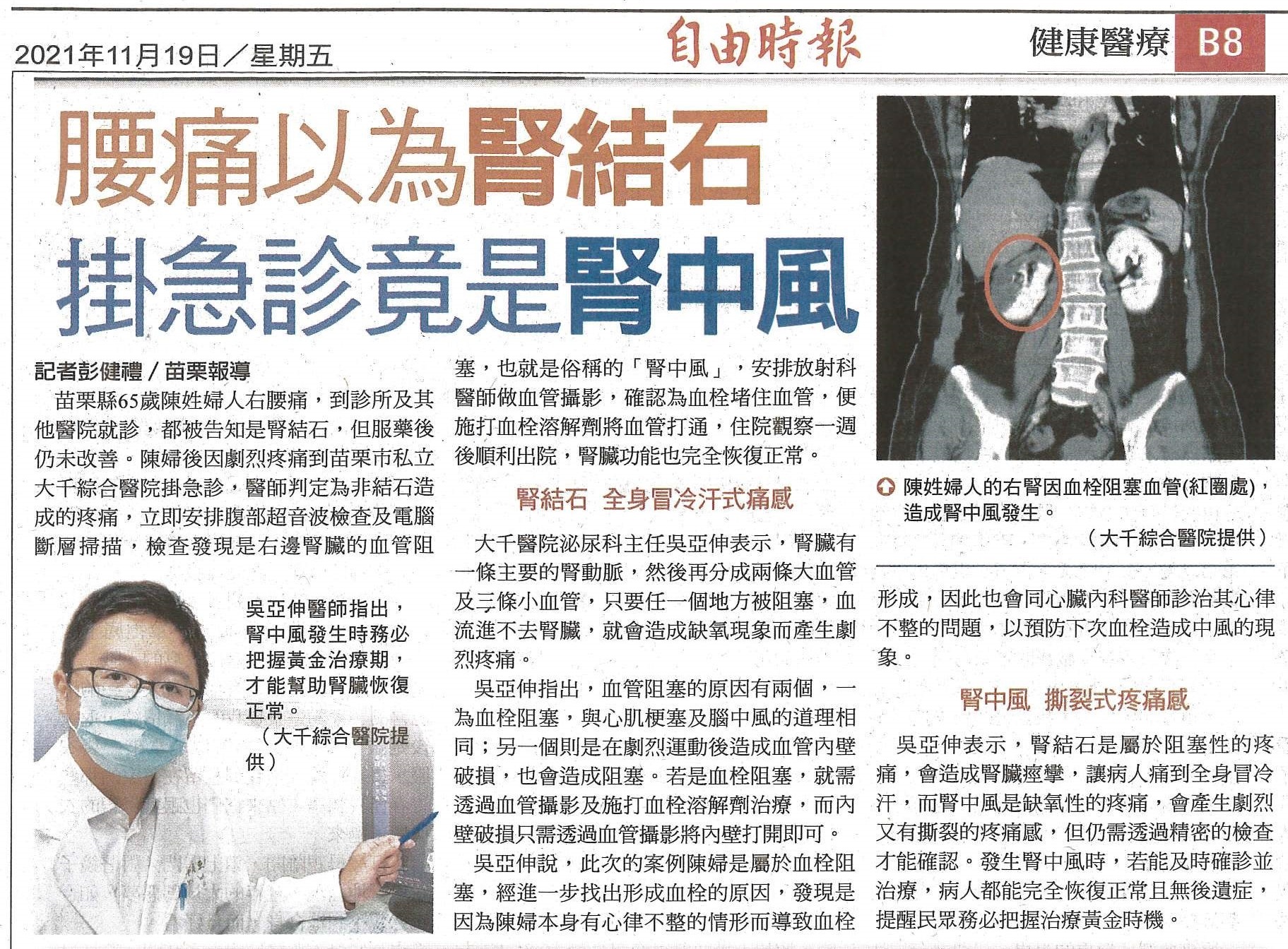1101119自由-腰痛以為腎結石掛急診 竟是腎中風