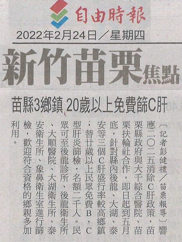 1110224自由-苗縣3鄉鎮20歲以上免費篩C肝