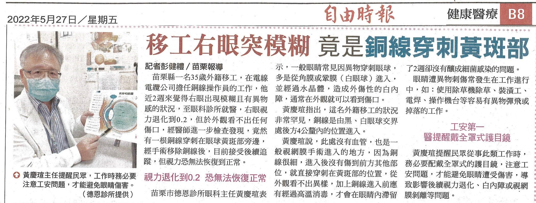 1110527自由-移工右眼突模糊竟是銅線穿刺黃斑部