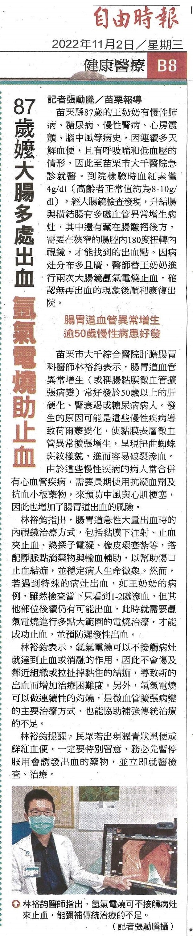 1111105自由-87歲嬤大腸多處出血氬氣電燒助止血