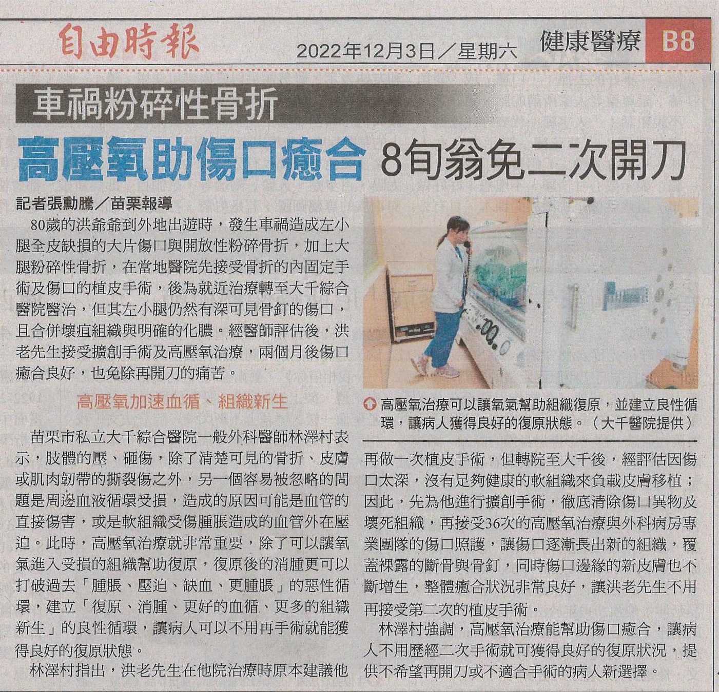 1111203自由-車禍粉碎性骨折高壓氧助傷口癒合8旬翁免二次開刀