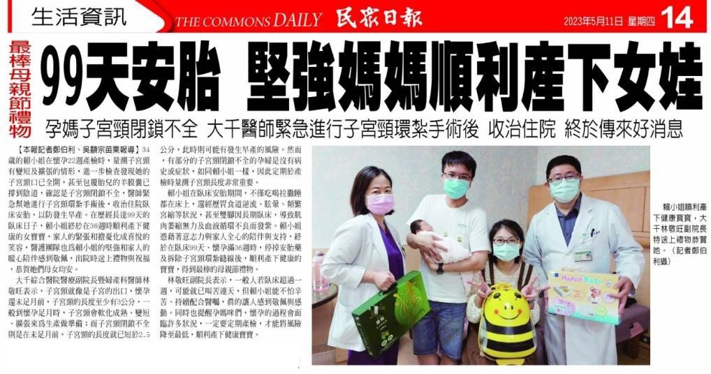 1120511民眾日報-99天安胎 堅強媽媽順利產下女娃