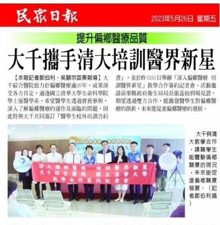 1120526民眾日報-提升偏鄉醫療品質大千攜手清大培訓醫界新星
