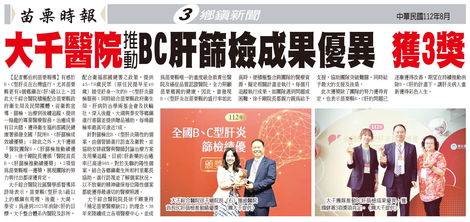 1120803苗栗時報-大千醫院推動BC肝篩檢成果優異 獲3獎