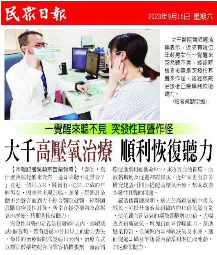 1120916民眾日報-大千高壓氧治療 順利恢復聽力