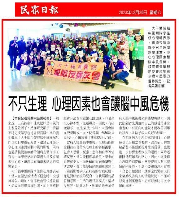 1121230民眾日報-不只生理 心理因素也會釀腦中風危機