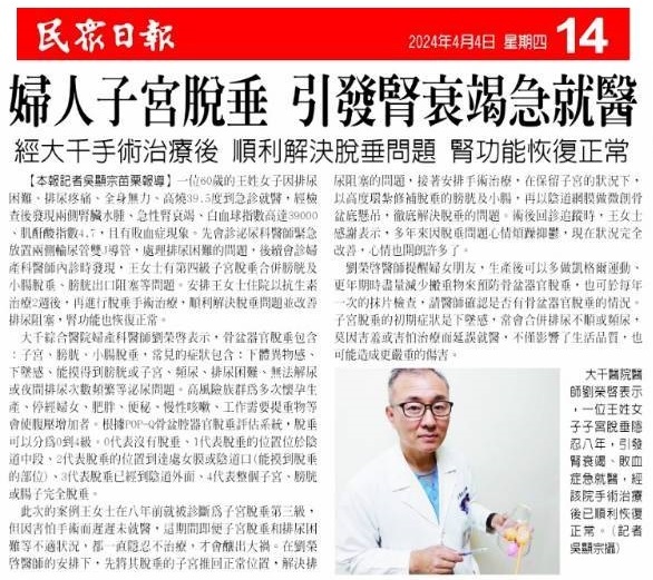 1130404民眾日報-婦人子宮脫垂 引發腎衰竭急就醫