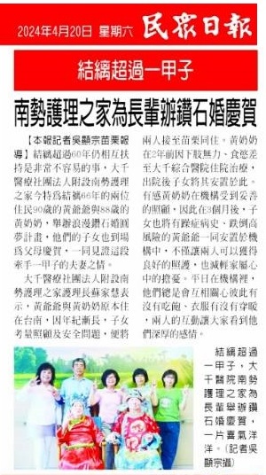 1130420民眾日報-南勢護理之家為長輩辦鑽石婚慶賀
