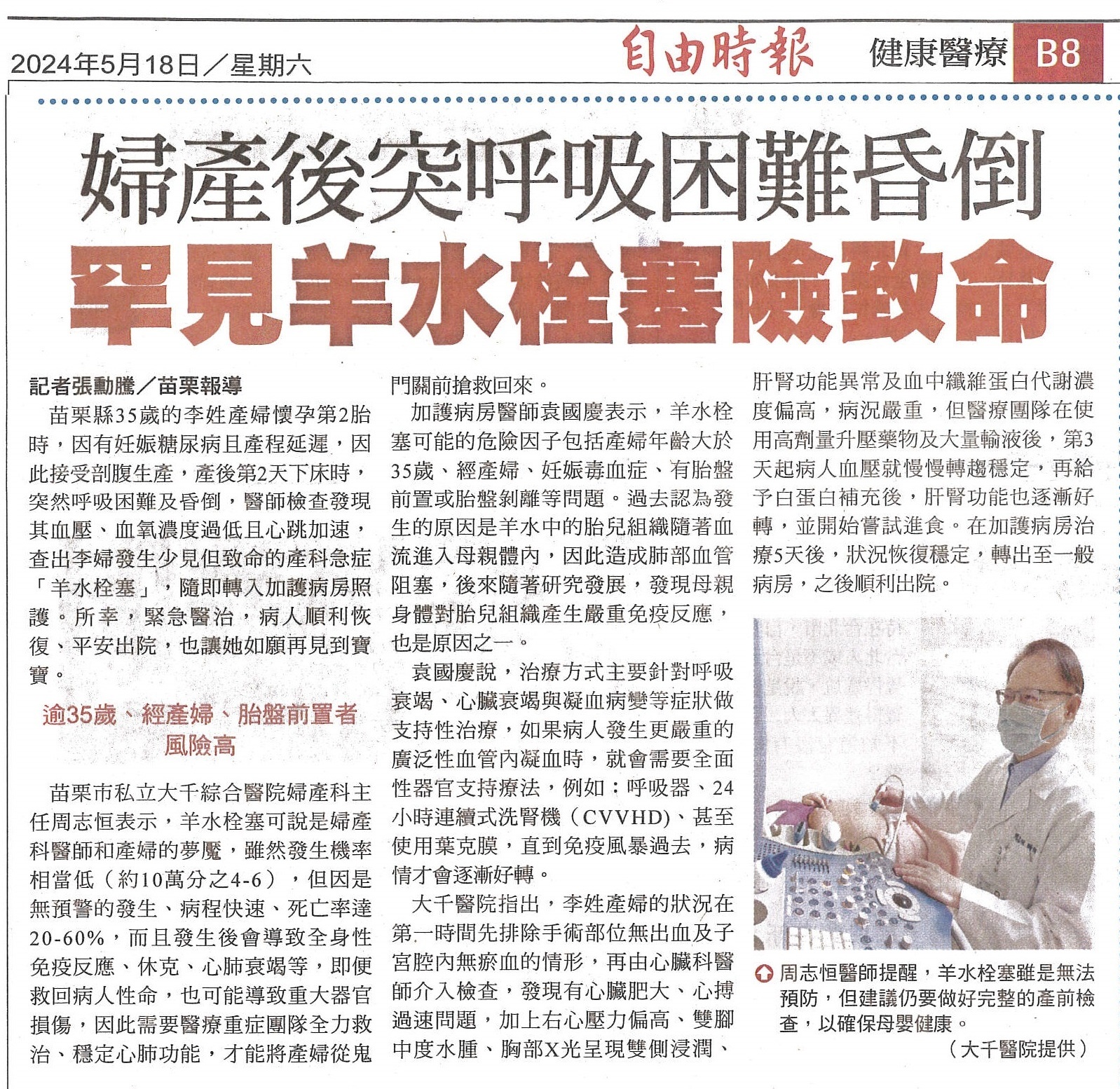1130518自由-婦產後突呼吸困難昏倒 罕見羊水栓塞險致命