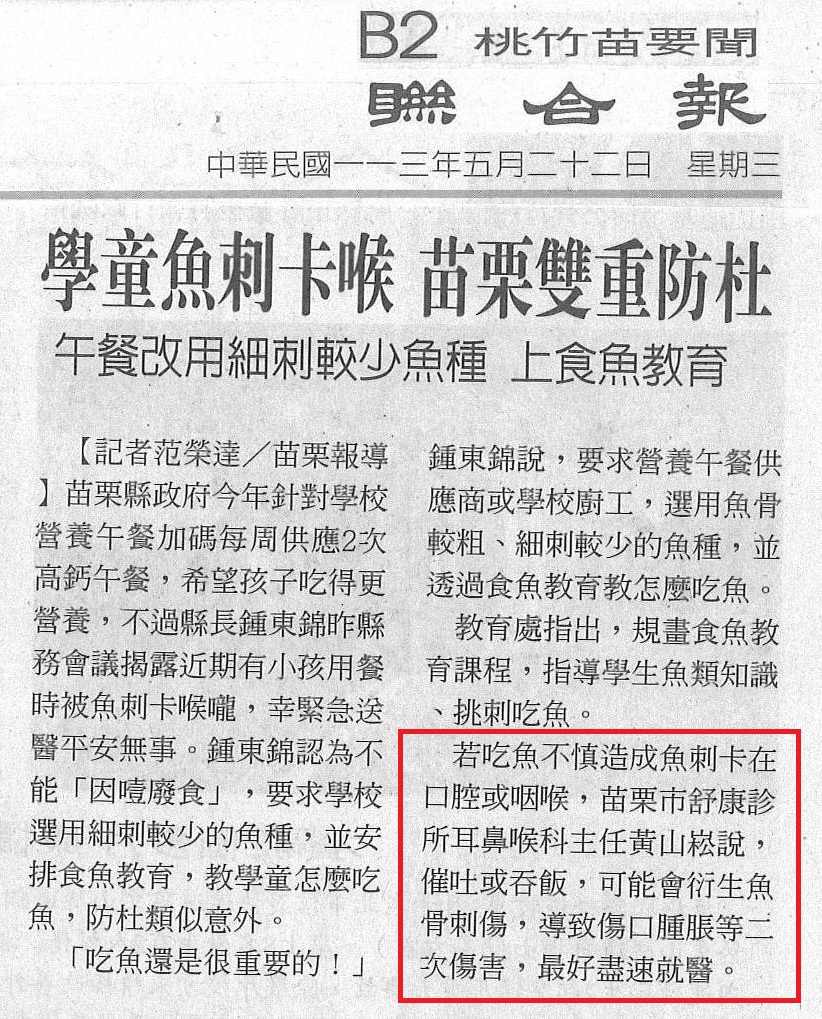 1130522聯合-學童魚刺卡喉 苗栗雙重防杜