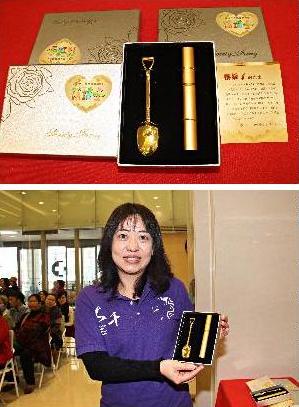 「筷鏟子」禮盒裡有金色的「好孕環保筷」,象徵生生不息,還有同等大小的「好孕鏟」,有「快快生子」意涵,共500組,上午亮相吸引許多民眾目光,獲贈民眾可將好孕筷、好孕鏟拿到註生娘娘廟加持,或放在床頭,以達「助孕」效果。