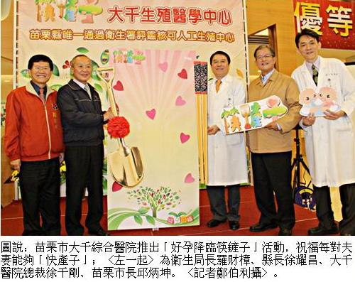 苗栗時報【記者鄭伯利報導】國內生育率偏低,為鼓勵難孕夫妻「做人」,大千綜合醫院推出「好孕降臨筷鏟子」活動,只要是首次到大千生殖中心接受人工生殖或試管嬰兒的民眾,即可獲贈一組「好孕筷、好孕鏟」禮盒,祝福每對夫妻能夠「快產子」。 為挽救年年下滑的生育率,大千生殖中心推出「好孕降臨筷鏟子」活動,縣長徐耀昌、大千醫院總裁徐千剛、苗栗市長邱炳坤等人上午出席記者會,鼓勵年輕男女「增產報國」,同時希望「好孕筷、好孕鏟」能為難孕夫妻帶來「好孕兆」。