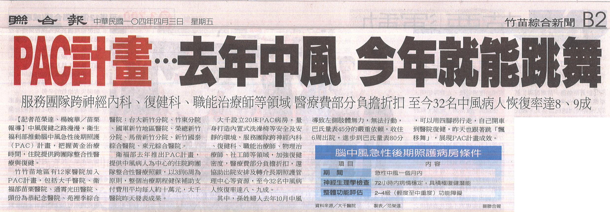 104.04.03聯合:PAC計畫去年中風今年就能跳舞