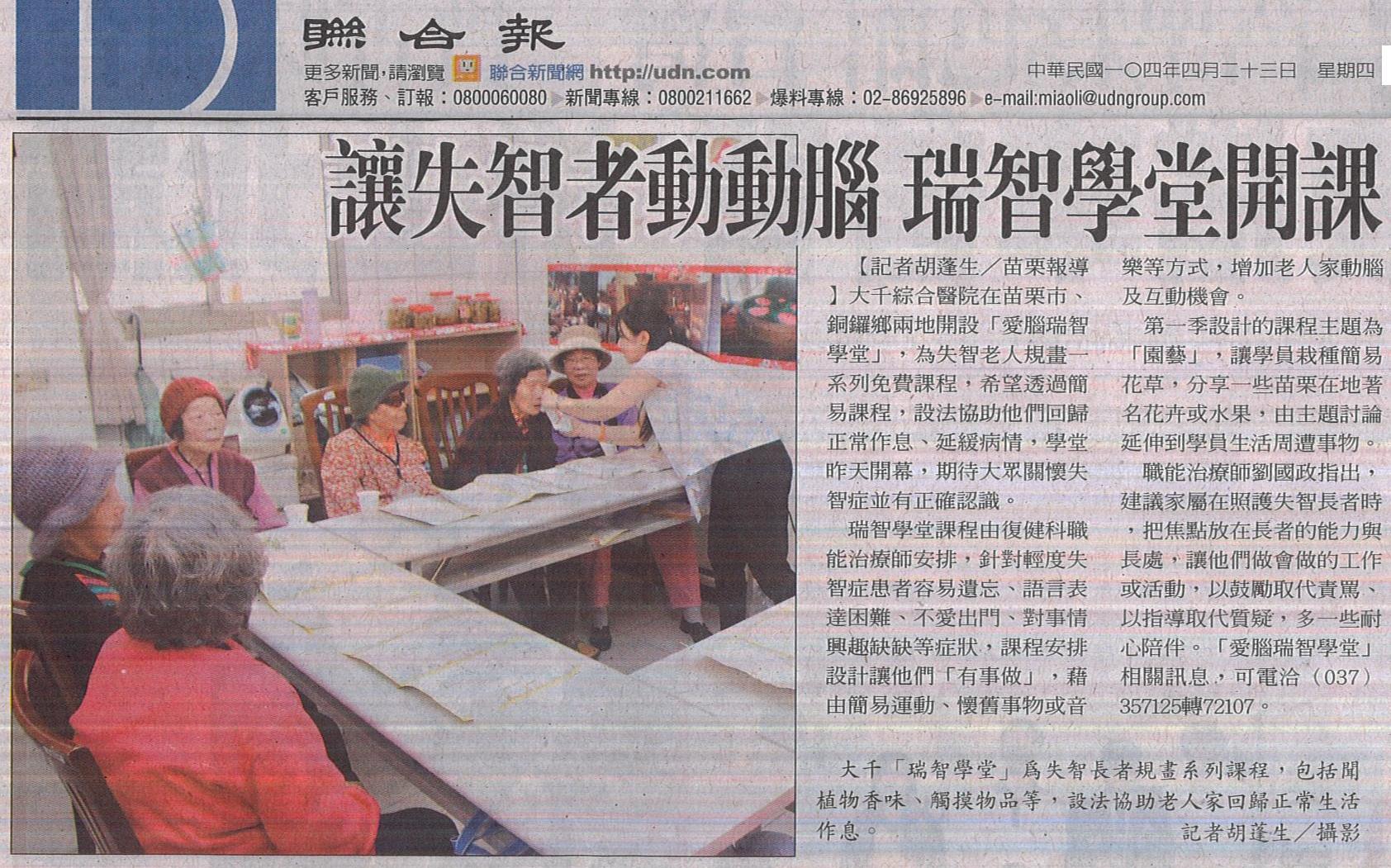 104.04.23聯合:讓失智者動動腦瑞智學堂開課