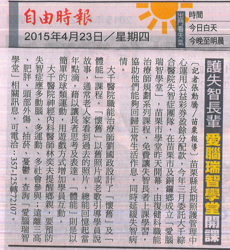 104.04.23自由:護失智長輩愛腦瑞智學堂開課