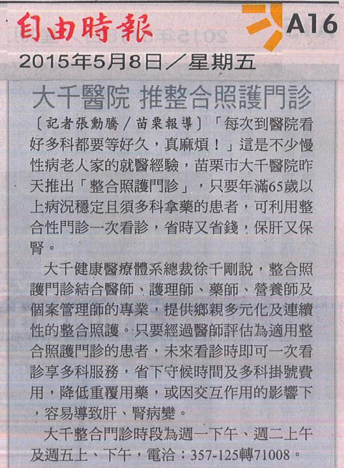 104.05.08自由:大千醫院推整合照護門診