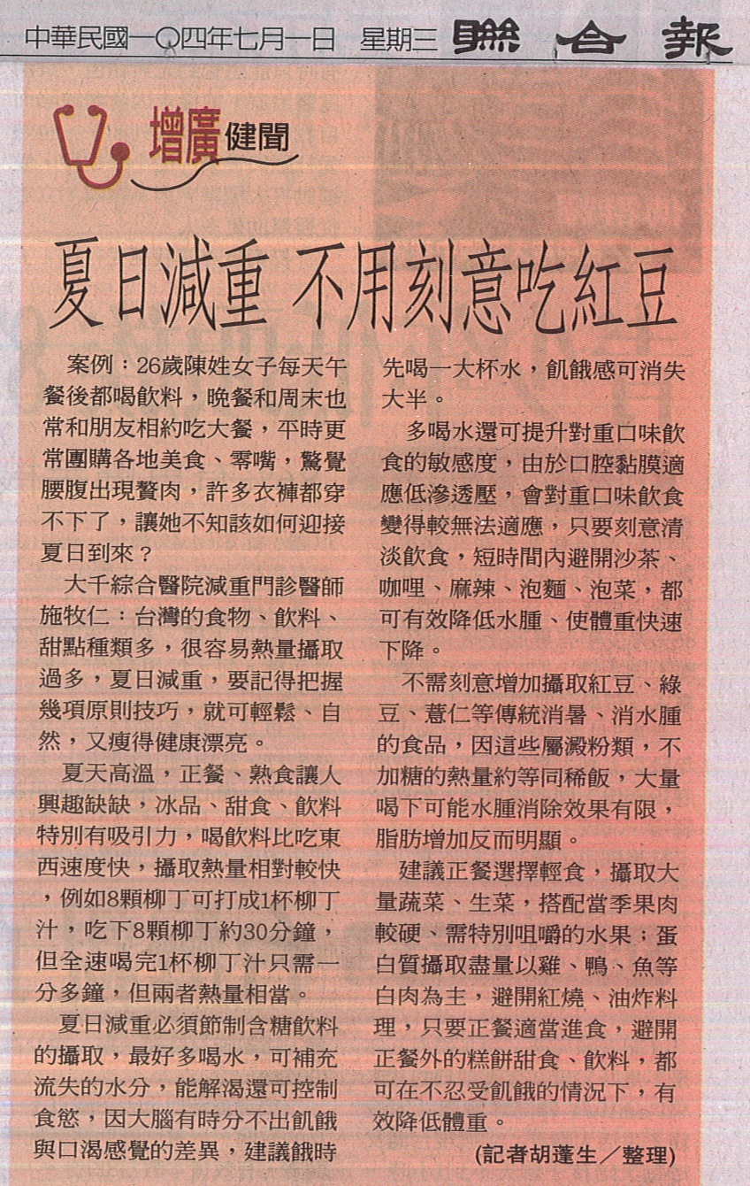 104.07.01聯合:夏日減重不用刻意吃紅豆