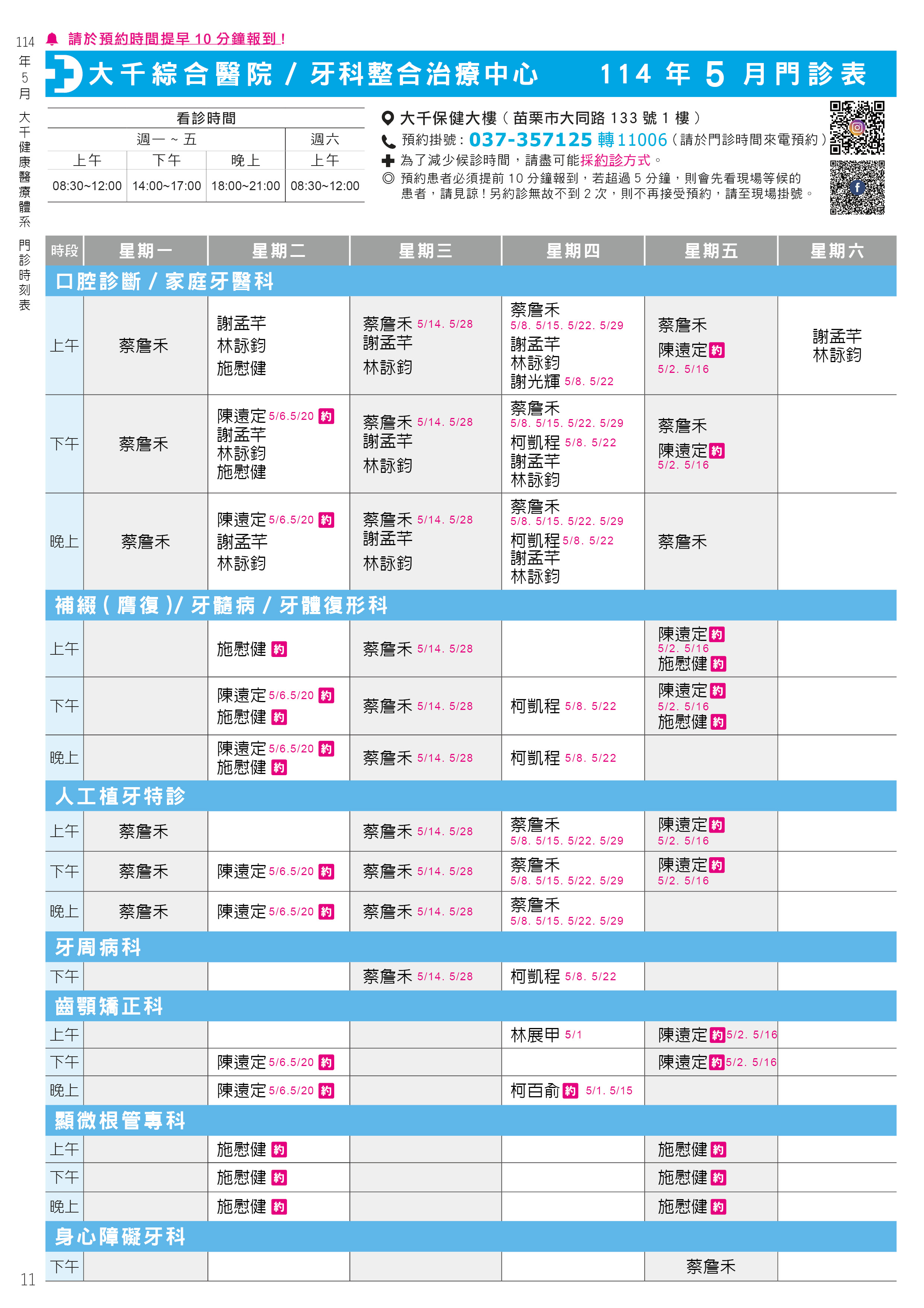 大千綜合醫院牙科整合治療中心 - 門診時間