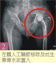 進行人工髖關節手術的患者90%以上術後都能達到良好的功能恢復及疼痛改善,術後最常發生的併發症便是脫臼、感染、人工關節鬆脫。一般來說,人工關節有感染的情形都須手術治療,在急性感染期可行清創手術保留人工關節,若感染已進入慢性感染期,則必須移除所有的人工關節。除了手術之外,也必須投予有效之抗生素治療,抗生素療程須達六周以上,確定感染控制之後才可再行二階段關節重建手術。近年來研究指出,人工關節移除後以抗生素骨水泥製作關節模子置入控制感染的成功率可達90%以上,一方面可提升局部抗生素釋放濃度,一方面可讓病患提早下床復健活動,維持肌肉、軟組織的狀況及強度,使得二階段手術時更為輕鬆簡單。