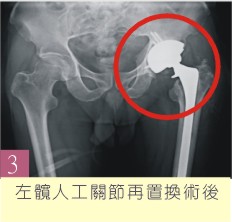 林先生出院後改以口服抗生素持續感染控制,門診追蹤發炎指數也改善到正常範圍內,故於兩個月後安排住院及二階段左髖人工關節再置換手術。由於病患左髖已手術過三次,在骨盆髖臼及近端股骨都已有骨缺損的狀況,術中在髖臼處以異體骨移植彌補骨缺損並以鉭金屬罩杯重建,在股骨的部分則是以翻修型加長柄來達到良好的人工關節固定,術後兩個月後病患傷口恢復良好,能持單手拐杖行走且沒有脫臼的情形發生。