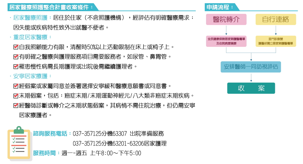 為了讓不方便出門就診的長者與患者可以在家中接受照護,健保署實施「全民健康保險居家醫療照護整合計畫」,服務包含:「居家醫療」、「重度居家醫療」及「安寧療護」三照護階段,依照患者的需要,提供服務與照護轉介。由醫護人員組成居家整合照護團隊,主動走入長者或是行動不方便的患者家中,提供完整且持續的醫療照護。