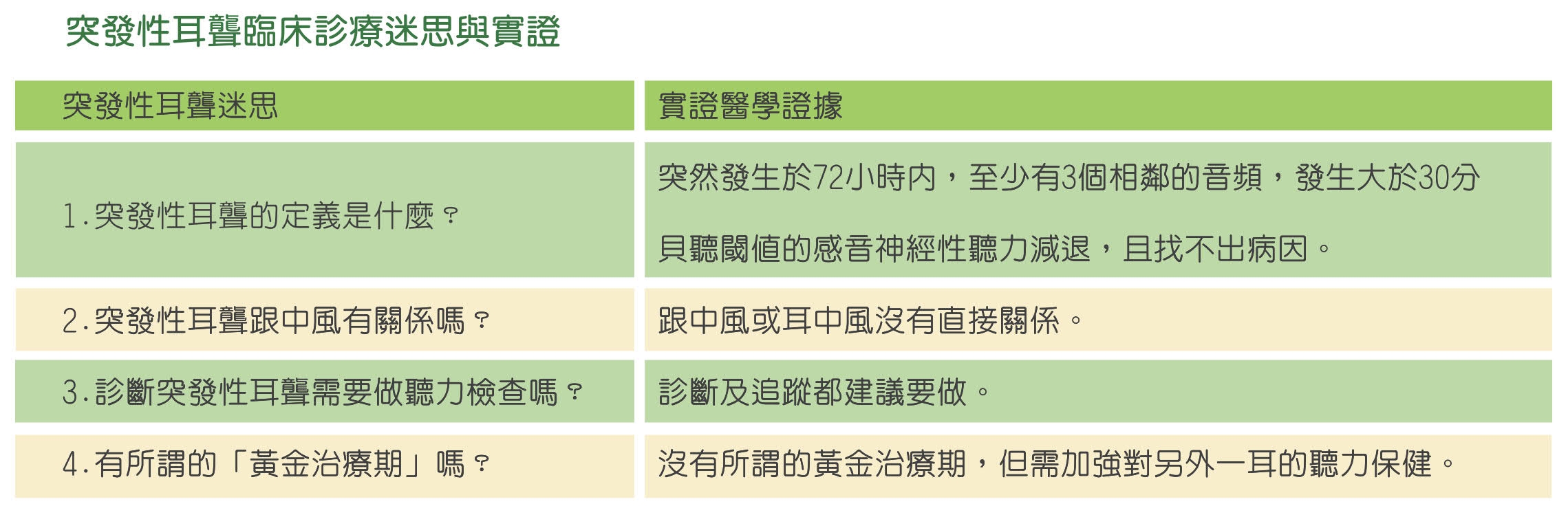 突發性耳聾是聽力障礙的急症,合併耳鳴、暈眩等症狀。雖有不經治療而自動痊癒的情形,但無法預測症狀是否短時間內改善,導致患者相當難受。建議及早找耳鼻喉科醫師問診,並由專業聽力師做正確的聽力檢查及後續追蹤檢查,給予適當的藥物治療和專業諮詢,只要經過治療,60%的患者其聽覺都可以獲得良好的改善及恢復。