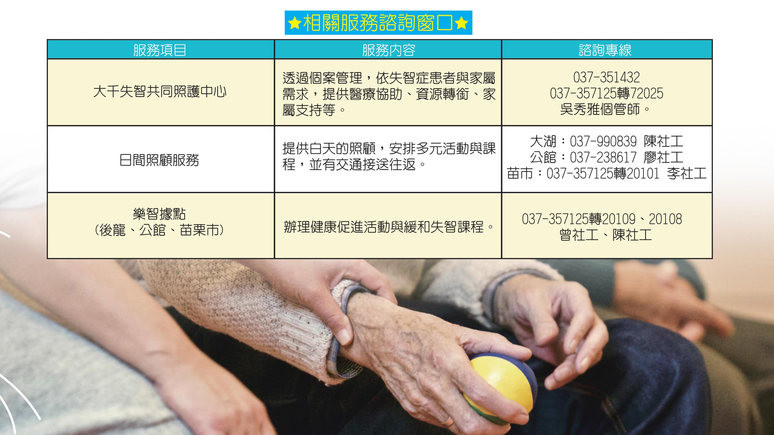 日照中心的陳阿婆,因上班的家屬總擔心阿婆會走失,加上阿婆日夜顛倒、常忘關瓦斯、異常飲食等行為,讓家屬困擾不已,故向長照中心申請日間照顧服務。阿婆初到日照中心時,對於安排的活動往往無法配合,中午用餐有時會搶食其它長輩的餐點甚至出現過度飲食的情況,透過工作人員的關心、鼓勵及指導,慢慢的開始適應中心的作息與規定,對於活動的參與度也提高很多,從上課開始10分鐘後就離開,到現在能完整參與並分享,甚至當上團體的小班長,幫忙帶動其它長輩參與活動。家屬表示自從阿婆到日照中心後,生活作息回歸正常,不再日夜顛倒,以往的問題行為,也甚少發生,讓他們能安心工作,身心皆獲得充分的休息。在年長者之疾病照護及護理中,其中失智症為最常見的疾病之一,失智症的家屬為了應對長輩出現的不同問題行為,往往需要付出很多的心力,在工作、家庭、健康等方面都會有影響,而隨著失智症的進程,失智長輩的自理能力與問題行為會越來越嚴重,導致家屬除了產生心理壓力外,生理上的壓力也隨之出現,產生憂鬱、挫折、憤怒、體力下降及失眠等情形。