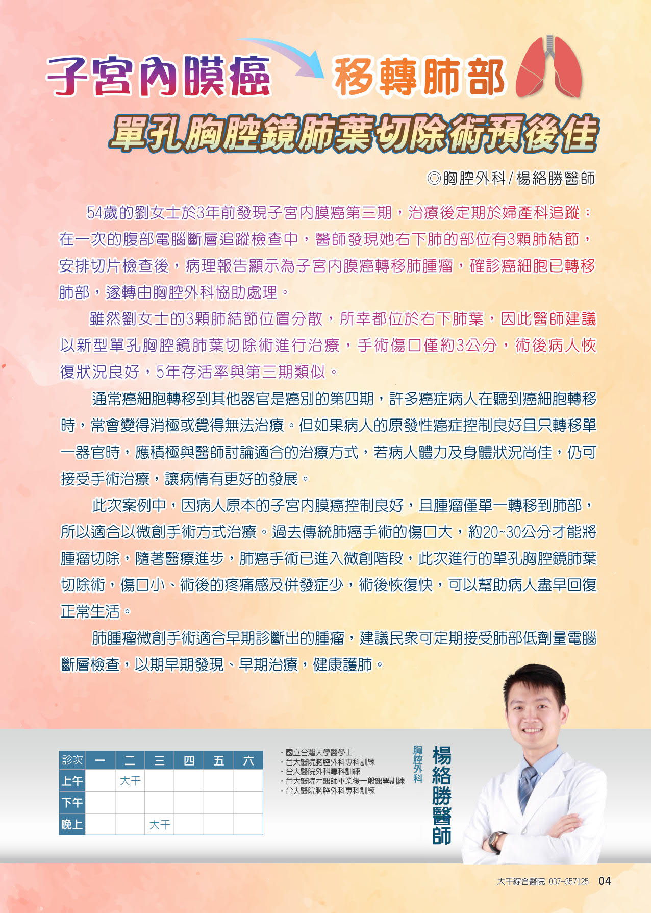 子宮內膜癌移轉肺部 單孔胸腔鏡肺葉切除術預後佳