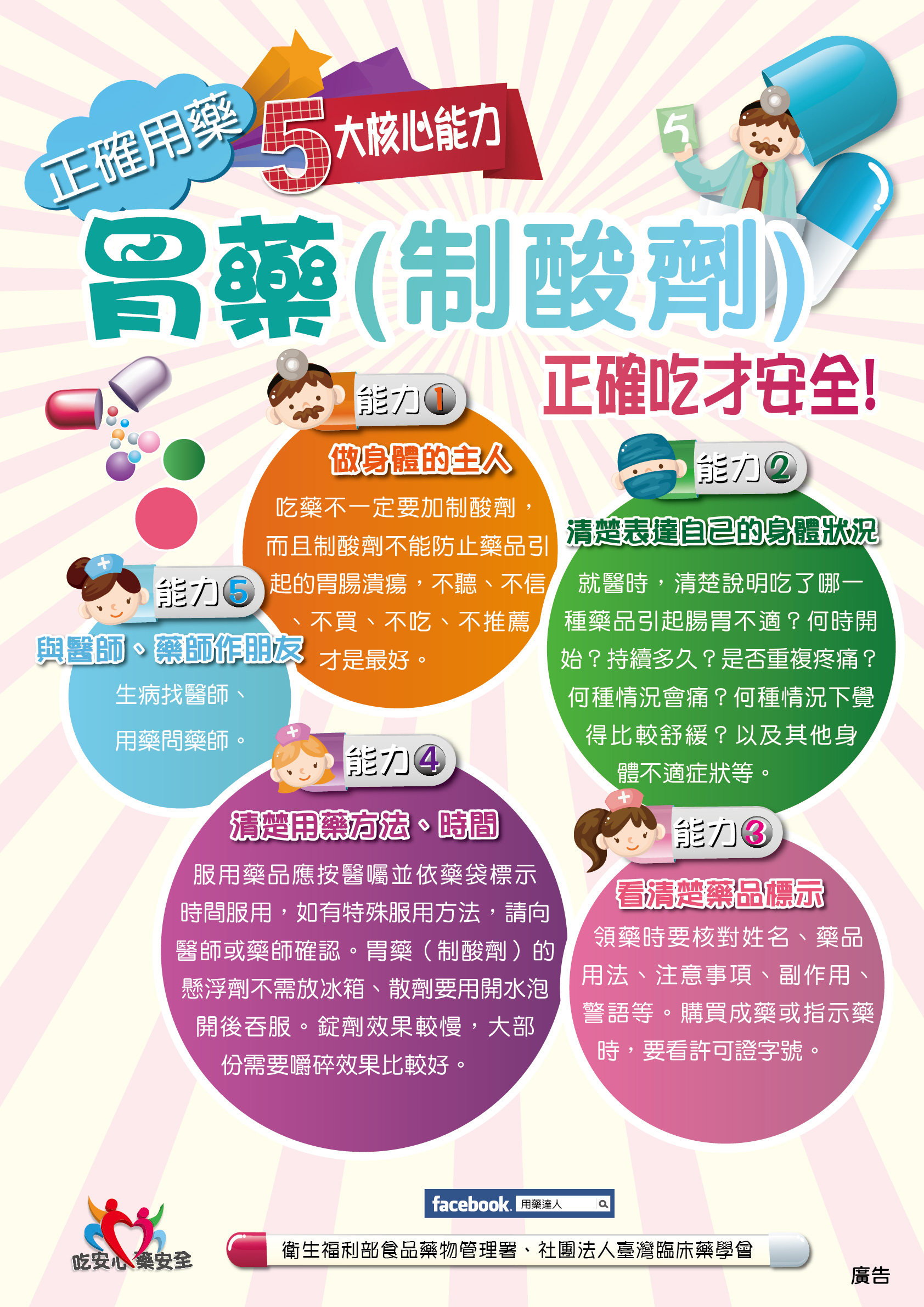 (一) 要了解藥物風險: 長期使用制酸劑(胃藥)可能會造成胃酸不足、影響營養吸收,導致腸胃細菌過度生長而增加感染等風險,另外其他常見的制酸劑,像是含鋁成分可能會造成便秘;含鎂成分可能會造成腹瀉等情形。